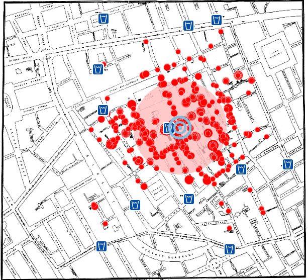 عندما أصاب وباء الكوليرا مدينة لندن قام الطبيب جون سنو عام 1854 برسم خريطة للمدينة مشيراً إلى مكان سكن المصابين. فتبيّن بوضوح أن المرضى سكنوا قرب مضخّة مياه شربوا منها، فجاء الاستنتاج بأن المياه ملوّثة. في حينه شكّلت هذه الخريطة حدثاً هامّاً في الصحّة العامّة وعلم الوبائيّات. أصبح للمكان معنى أكبر في دراسة الأمراض وعلاجها.