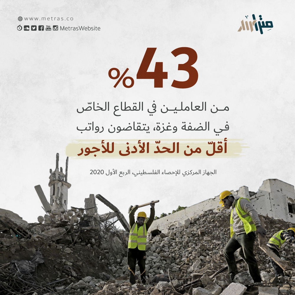 بحسب الجهاز المركزي للإحصاء الفلسطينيّ، فقد أشارت بيانات القوى العاملة للربع الأول من العام الجاري-2020 إلى أنّ حوالي 43% من العاملين في القطاع الخاصّ في الضفَّة وغزَّة يتقاضون رواتب أقلّ من الحدّ الأدنى للأجور. وبشكلٍ عامّ، فإنّ القطاعات التي تنتشر فيها مسألة دفع أجورٍ أقلّ من الحدّ الأدنى هي قطاعات التجارة والفندقة، ثم يليها قطاع التعدين والصناعات التحويليّة، ثمّ قطاع البناء والتشييد، وصولاً إلى قطاعي الصيد والزراعة.