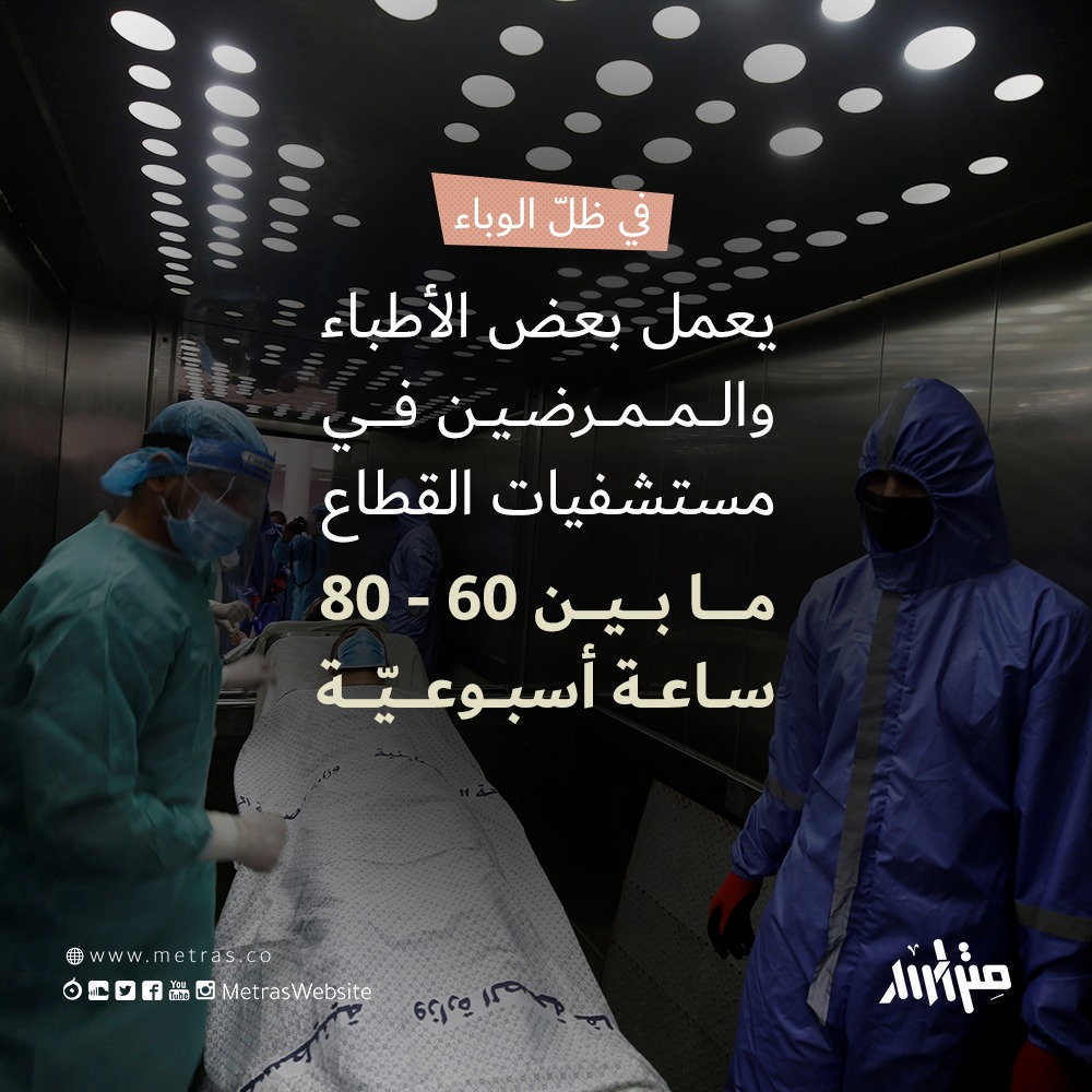 يتراكم فوق هذه الضغوطاتِ وحالةِ التوتر الدائمة اضطرارُ الطواقم الطبيّة للعمل لساعات طويلة ومرهقة. يتجلّى ذلك في قسمٍ حساسٍ في ظروف الوباء؛ قسم العناية المكثّفة. في أغلب المستشفيات، يُغطي قسمَ العناية المكثّفة خلال المناوبة الواحدة مُختصٌ واحدٌ فقط، وذلك بغض النظر عن عدد الأسِرّة ومشغولاتها، التي قد تصل إلى 10 مرضى في القسم الواحد، وهو أمرٌ شديد الاستنزاف بحسب شهادات الأطباء. هذا إلى جانب، زيادة عدد ساعات العمل لطواقم الصحّة المختلفة، والتي تراوحت لأطباء برامج التخصص ما بين 60-80 ساعة، امتدّت أحياناً إلى 100 ساعة دوام أسبوعيّة.