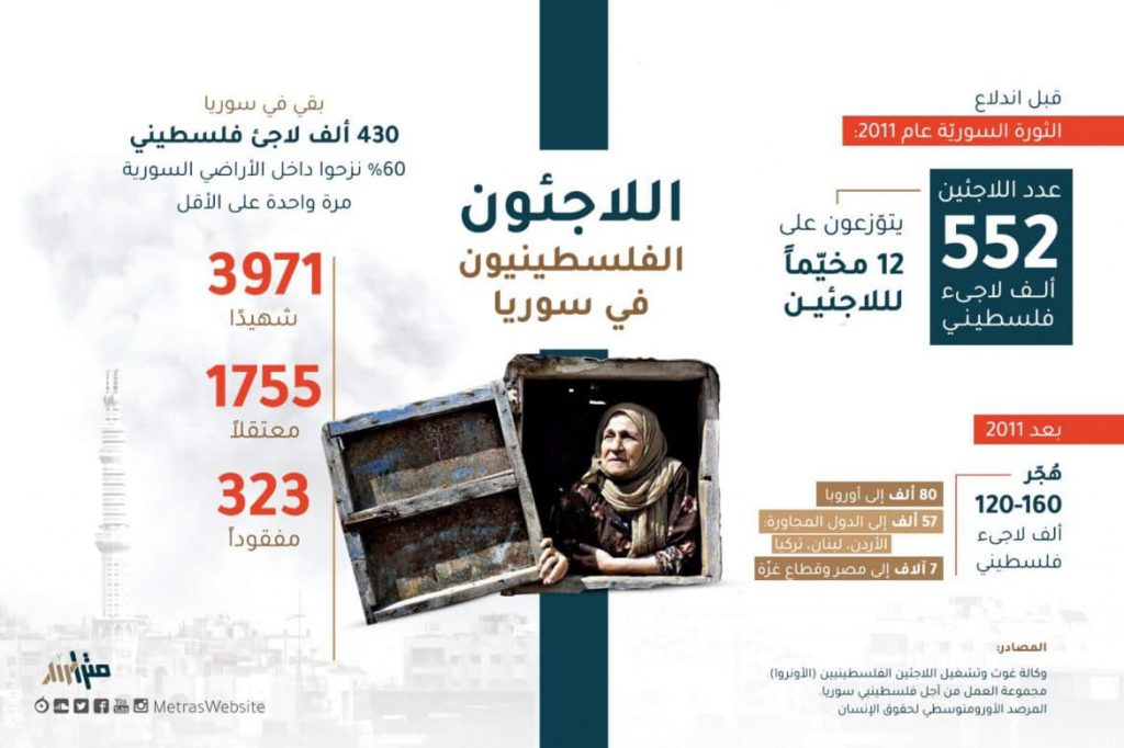 لنأخذ سوريا وحال اللاجئين الفلسطينيين فيها. عاش في سوريا قُبيل عام 2011 أكثر من نصف مليون لاجئ فلسطينيّ، هُجّر منهم مجدداً بعد اندلاع الثورة أكثر من 160 ألف فلسطينيّ وصلوا بغالبيّتهم إلى أوروبّا وتركيّا. أما من ظلّوا لاجئين في سوريا رغم الحرب، فقد قُتل منهم أكثر من 3900 إنسان، وهُجّر 60 بالمئة منهم إلى مناطق أخرى فيها، بينما يعيش 95% منهم "بأمس حاجةٍ للمساعدة الانسانيّة المستدامة" وذلك بحسب وكالة غوث اللاجئين – الأونروا.