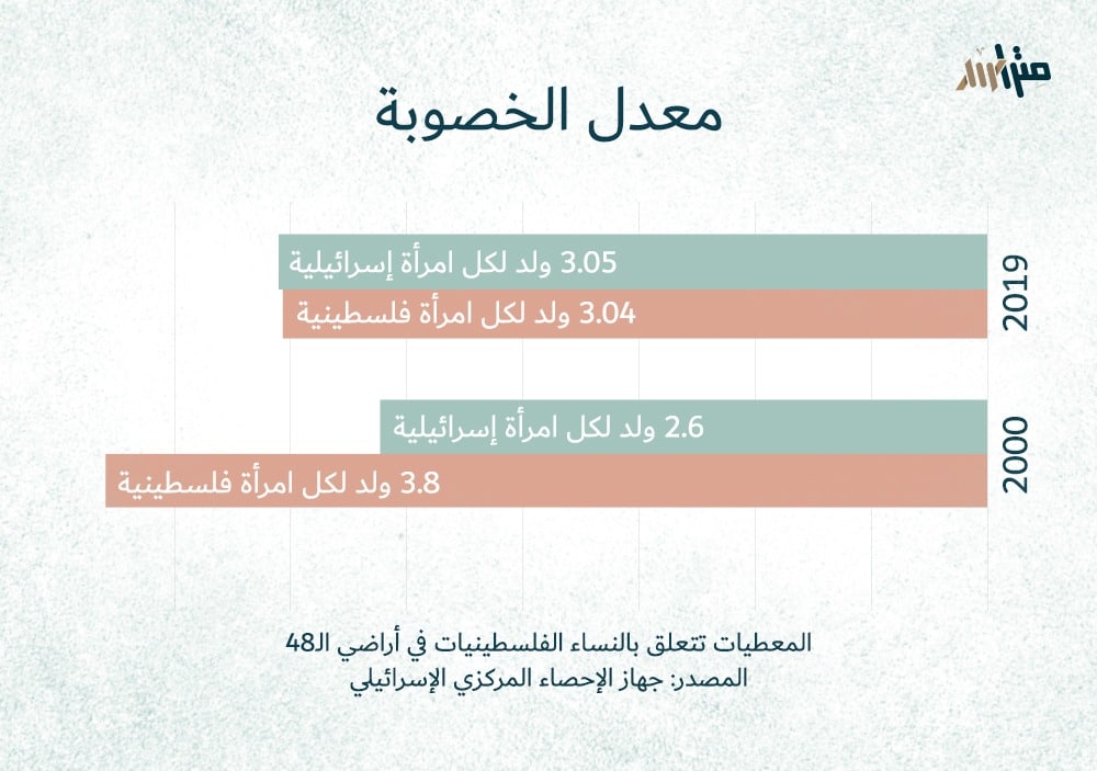 في ذات السنة نشر مركز الأبحاث الإسرائيلي "تاوب" -وهو مركزٌ متخصصٌ في بحث السياسات الاجتماعيّة في "إسرائيل"- معطياتِه حول نسب الولادة في المجتمع الإسرائيليّ والمجتمع الفلسطينيّ في الأراضي المحتلة عام 1948. وقد ظهر انخفاضٌ في نسب الولادة في المجتمع الفلسطينيّ مقابل ارتفاعها في الإسرائيليّ. كذلك تشير دائرة الإحصاء المركزيّ في "إسرائيل" إلى نمط انخفاضٍ حادٍّ في نسب الولادة في المجتمع الفلسطينيّ مقابل الإسرائيليّ، حيث نشهد ارتفاع نسب الولادة في المجتمع الإسرائيلي منذ عام 2000 مقابل انخفاضه في المجتمع الفلسطينيّ. وبينما لا يمكننا إغفال العلاقة العكسيّة بين نسبة التعليم (التي ترتفع) ونسب الولادة (التي تنخفض) في المجتمع الفلسطينيّ، نجد في المجتمع الإسرائيلي علاقةً طرديّةً بين النسبتين.