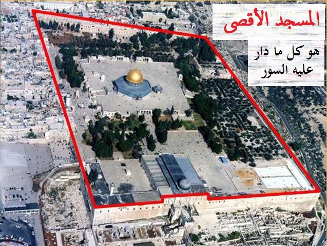 المسجد الأقصى المبارك الحقيقي هو كل ما دار عليه السور الرباعيّ شبه المستطيل، بمساحةٍ تصل إلى حوالي 144 دونماً، ويشمل كافة المباني فيه مثل قبّة الصخرة (المبنى ذو القبّة الذهبيّة) والجامع القِبلي (المبنى ذو القبّة الرصاصيّة) وغيره من المعالم، من قباب ومصاطب ومدارس وأروقة وخلوات ومصليات.