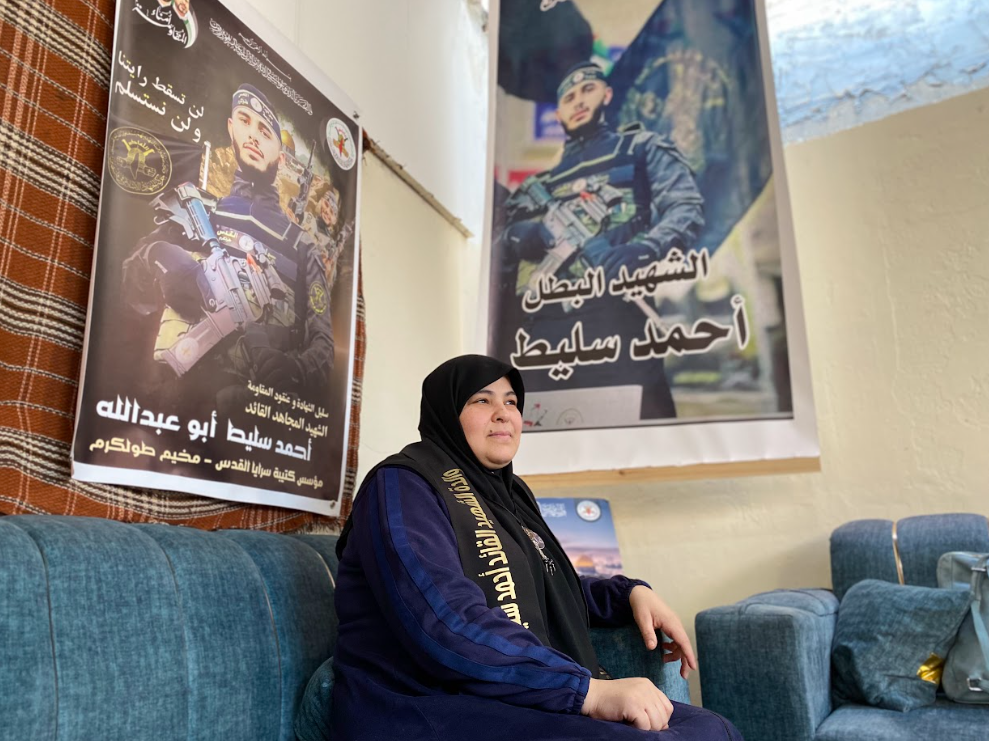 خلال المقابلة انشغلت إحدى نساء الحارة بضيافة المقاتلين وضيوفهم، مرة قهوة، ومرة شاي، ومرة بسكوت. يُشير إليها أبو شجاع بكونها "واحدة من خنساوات المخيم"، إذ لها ابن أسير وابنان مطاردان، إلا أنها في 17 كانون الأول\ديسمبر، أصبحت أم شهيد أيضاً. تقول هنادي شحادة، والدة الشهيد غيث، "بعيوني هدول، كلهم ولادي". تضيف هنادي: "بعزّ علينا ولادنا، هدول روحنا في الدنيا، بس بالمقابل بدهم حياة كريمة، ولهيك راحوا طريق الجهاد .. وأنا عندي إيمان بالله، وإيمان بقضيتنا.. ومؤمنة أنه ولادنا بعملوا بأمر ربنا".