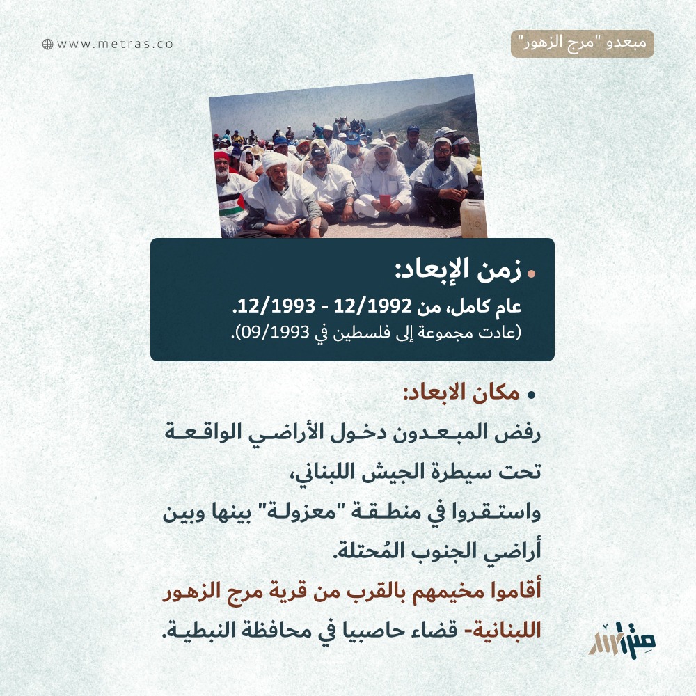 يُؤرّخ لإبعاد "مرج الزهور" من تاريخ 17 ديسمبر/كانون الأول 1992 وحتّى 17 ديسمبر/كانون الأول 1993. وهي العملية التي أبعدت فيها "إسرائيل" 415 معتقلاً فلسطينيّاً من حركتي "حماس" و"الجهاد" إلى الأراضي اللبنانيّة. العمليّة الإسرائيليّة التي هدفت إلى التخلّص من النشاط النضاليّ للحركتين، انقلبتْ على السّاحر، إذ تحوّلت فرصةً لصياغة قيادةٍ وتنظيمٍ لعب ويلعب دوراً محوريّاً في مقاومة "إسرائيل".