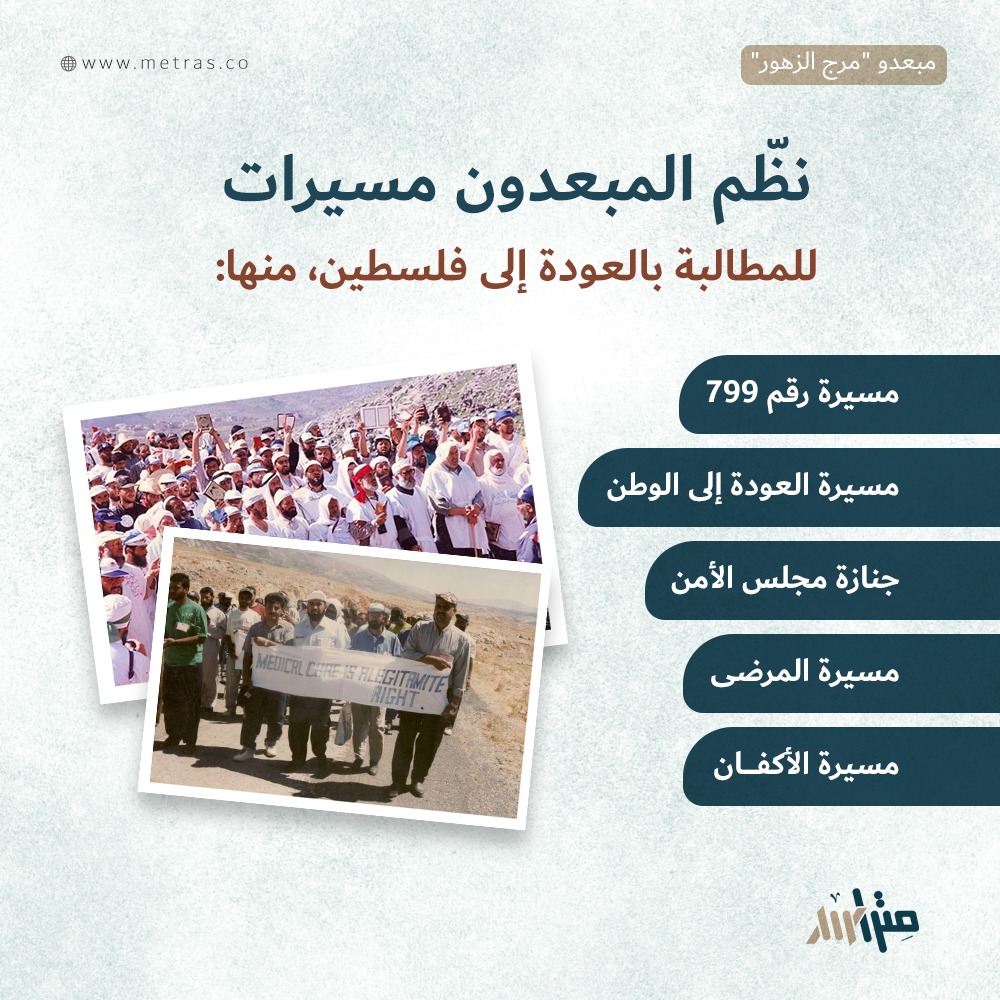 كذلك نُظّمت العديد من المسيرات والتظاهرات أيضاً، كـ"مسيرة العودة إلى الوطن"، وجنازة مجلس الأمن، ومسيرة المرضى، ومسيرة الأكفان. بالإضافة إلى ذلك، تأسست جامعة ابن تيميّة للمبعدين، والتي تخرّج منها 200 مُبعد، تلقّوا التعليم من قبل أساتذة متخصّصين في الشريعة الإسلاميّة والإدارة والعلوم السياسيّة والجغرافيا والطب واللغات والعلوم الإحيائية. ومن خلالها كانت تجري مؤتمرات ومسابقات ثقافيّة ومناظرات شعريّة، ودورات تدريبيّة، مثل الكارتيه. وأقيم فيها معرضٌ للحيوانات والنباتات والصّخور. وكان هذا التجديد وتلك القدرة على الحياة، من شأنها أن تُبقي قضيّة المبعدين قضيّة رأي عامّ ومحط اهتمام الصحافة العربيّة والدوليّة.