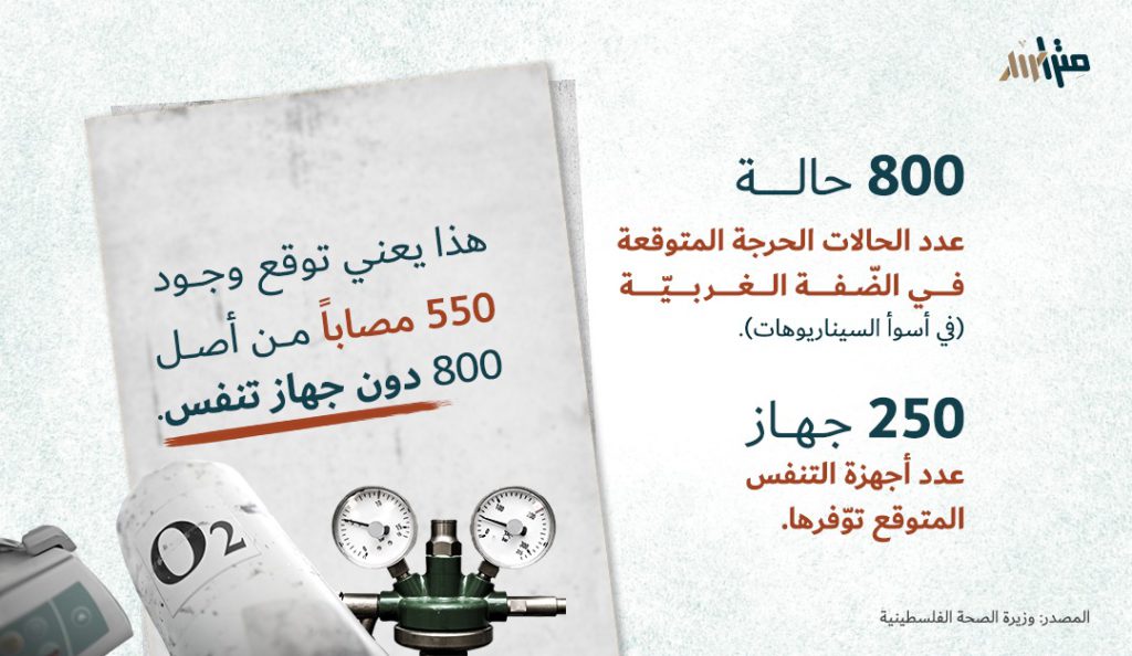 لكن، وبحسب "أسوأ السيناريوهات" المحتملة، من المتوقع أن يصل عدد الإصابات الحرجة، والتي ستحتاج علاجاً في وحدات العناية المكثفة إلى حوالي 800 حالة، وذلك بحسب وزيرة الصحّة الفلسطينيّة مي كيلة.