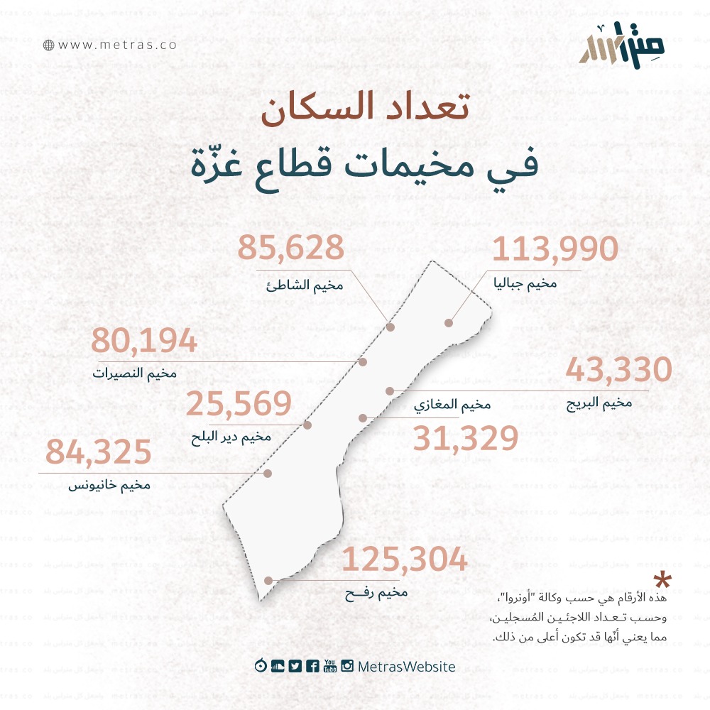 يشكل اللاجئون حوالي 73٪ من مجمل سكان القطاع الذين يزيد عددهم عن مليوني نسمة. وبينما يُشير جهاز الإحصاء المركزيّ إلى حوالي 5 آلاف شخص في الكيلومتر المربع، تُشير مصادر أخرى إلى 30 ألفَ شخصٍ في الكيلومتر المربّع الواحد في قطاع غزَّة، ما يجعلُ القطاع واحداً من أكثر المناطق كثافةً سكانيَّة في العالم.