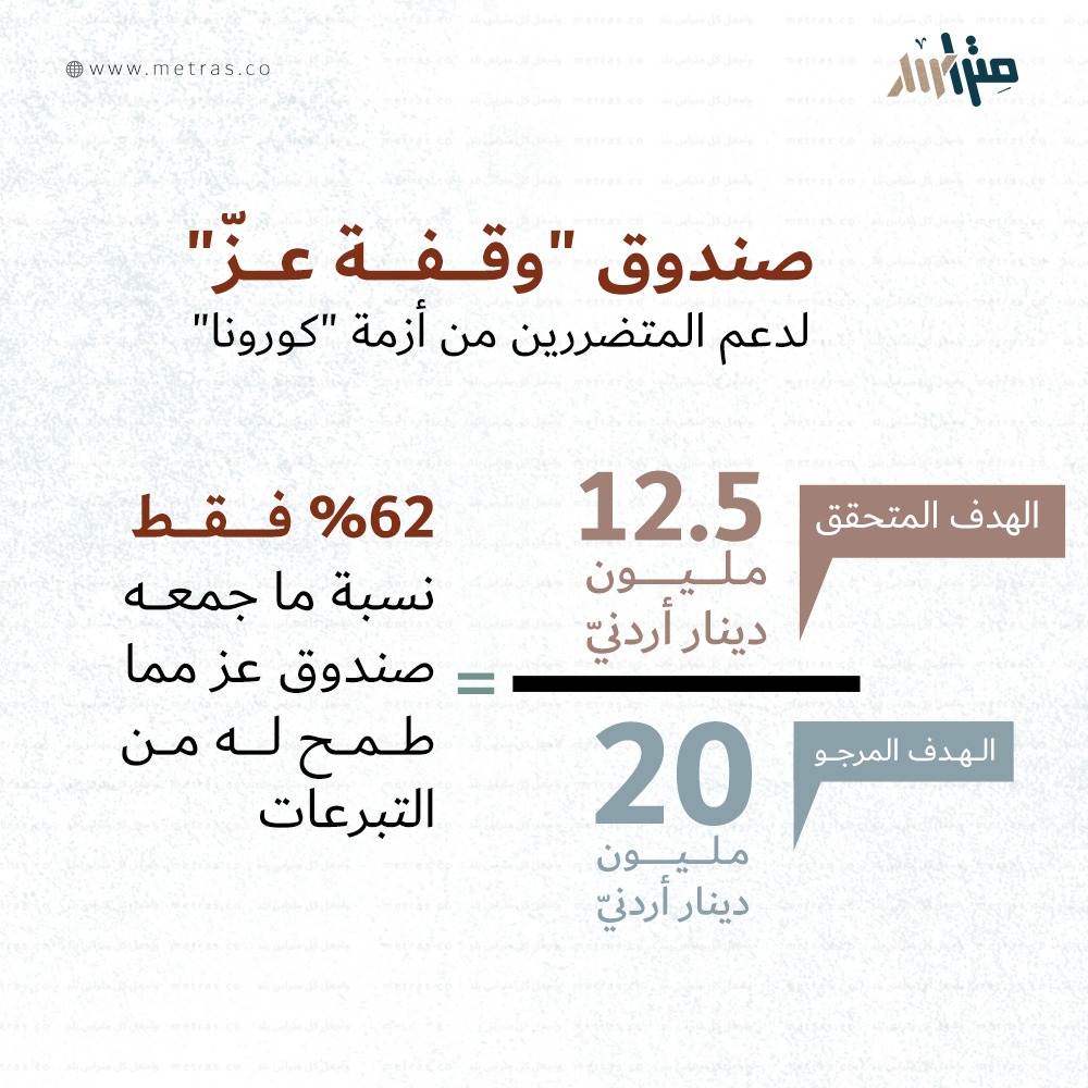 وبعد حوالي شهرين ونصف من التأسيس، في منتصف مايو/أيار الماضي، تمكّن الصندوق من جمع 12,5 مليون دينار أردنيّ فقط لا غير، وهو ما يُشكّل تقريبا 62% فقط من الهدف المبتغى الوصول إليه.