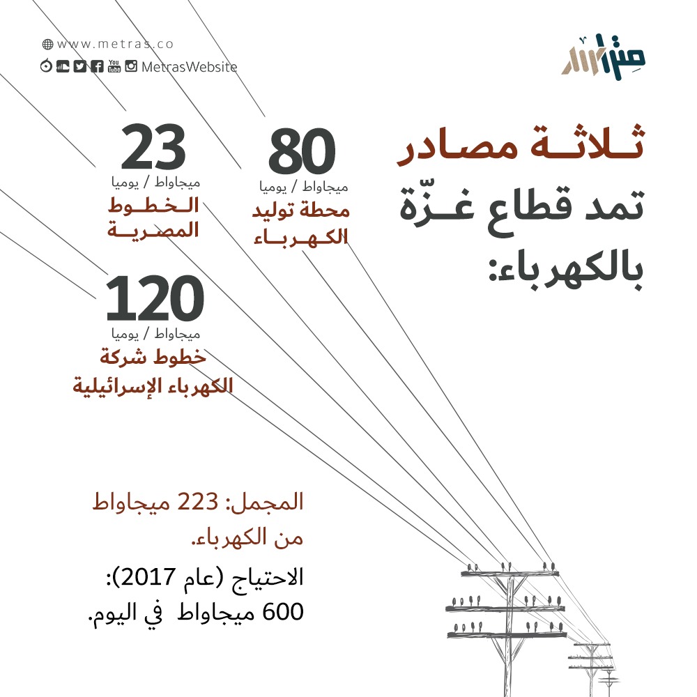 يعتمد وصل التيار الكهربائيّ في غزّة على ثلاثة مصادر أساسية. أوّلاً الخطوط المصريّة، وتوفّر 23 ميجاواط تتعرّض لانقطاعات دائمة. ثانياً؛ خطوط شركة الكهرباء الإسرائيليّة التي توفّر 120 ميجاواط، يخصم الاحتلال ثمنها من عائدات الضرائب على السُلطة الفلسطينيّة. أمّا محطّة توليد الكهرباء في غزّة، فهي شركة مُساهمة عامة توفّر ما لا يتجاوز 80 ميجاواط، تبيعها لسلطة الطاقة الفلسطينيّة، فتوزّعها بدورها على السكّان. عام 2017، بلغ احتياج السُكّان في قطاع غزّة من الكهرباء بين 450- 600 ميجاواط في اليوم، بينما لم يتوفّر منها إلا 223 ميجاواط.