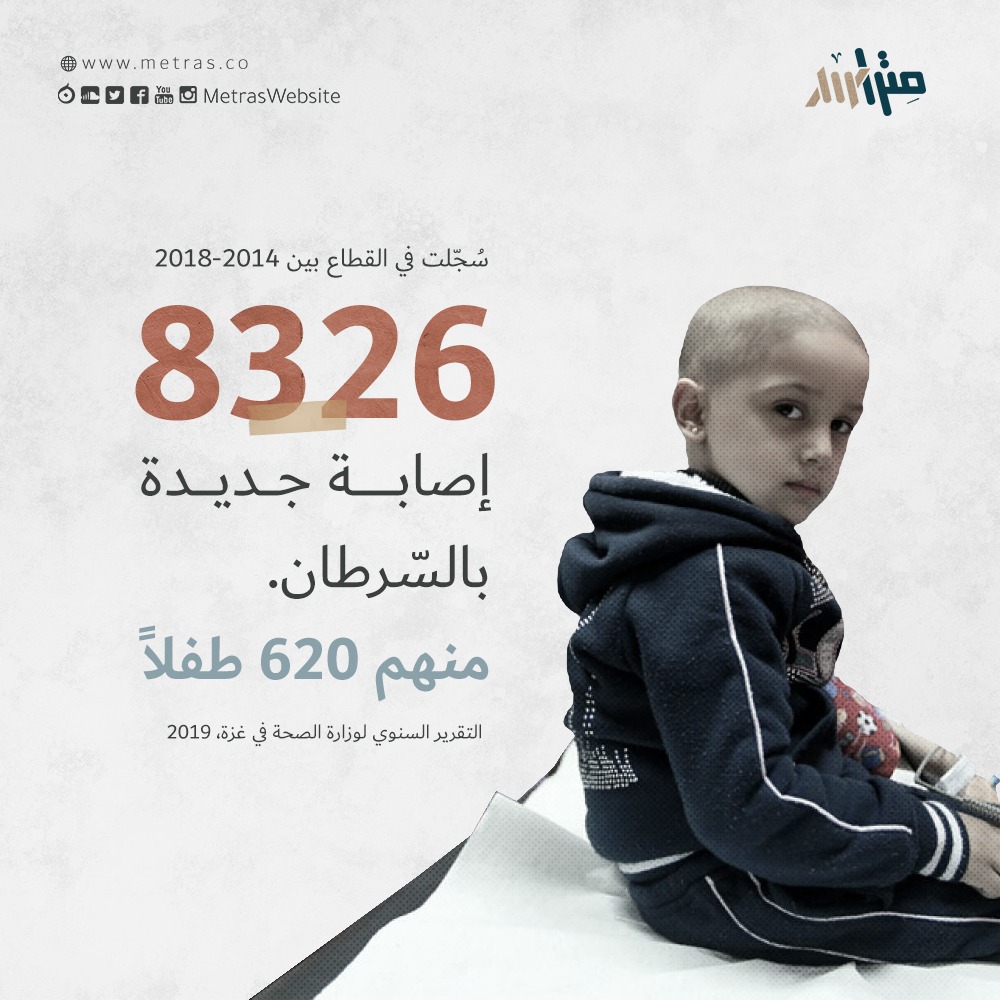 يُقدّر الطبيب محمد أبو ندى، مدير مستشفى الرنتيسي التخصصيّ في غزّة، أنّ القطاع يُسجّل شهريّاً ما بين 80-100 تشخيص لحالات جديدة مصابة بالسرطان، وبحسب وزارة الصحّة هناك فإنّ نسبة الإصابة بالسرطان هي 90 حالة لكل 100 ألف سنويّاً. يواجه أولئك وغيرهم من المرضى السابقين مصاعبَ في إجراء اختبارات تشخيص وعلاج المرض، لغياب الأجهزة التشخيصيّة والعلاجيّة اللازمة.