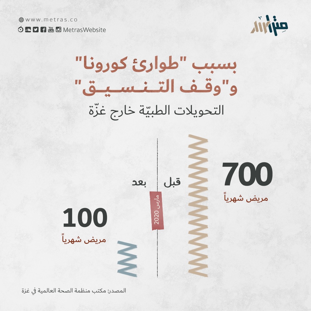 من ناحية ثانية، أوقفت دائرة العلاج بالخارج، والتابعة لوزارة الصحّة في رام الله، منذ حوالي ثلاثة أشهر التحويلات المُقدّمة لتغطية عمليات المرضى في المستشفيات الخاصّة (داخل غزّة). كما انخفض بدرجة كبيرة حجم التحويلات إلى المستشفيات الإسرائيليّة خاصّة بعد إعلان السّلطة في مايو/أيار الماضي "وقف التنسيق"، عدا عن رفض الاحتلال إعطاء تصاريح العلاج لكثيرين. وفق مكتب منظمة الصحّة العالمية في غزة، فإن حوالي 1700 مريض قدّموا تصاريح للعلاج الطبيّ خارج غزّة خلال هذا العام، لم يحصل سوى ربعهم على ذلك.