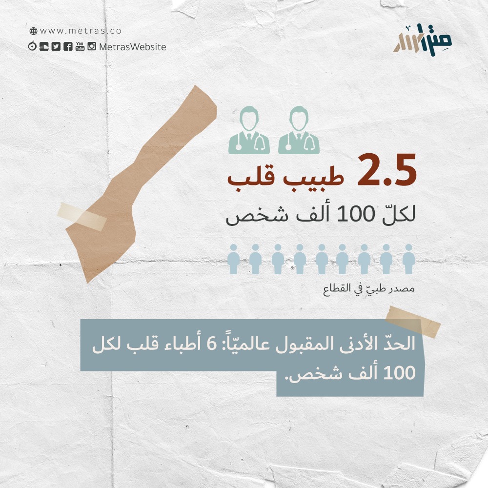 كذلك ثمة نقص في الكادر الطبيّ الخاصّ بأمراض القلب. يُقدّر حبيب عدد أطباء القلب الموجودين في قطاع غزّة بحوالي 2.5 طبيب قلب لكلّ 100 ألف شخص، فيما الحدّ الأدنى المقبول عالميّاً هو 6 أطباء قلب لكلّ 100 ألف نسمة.