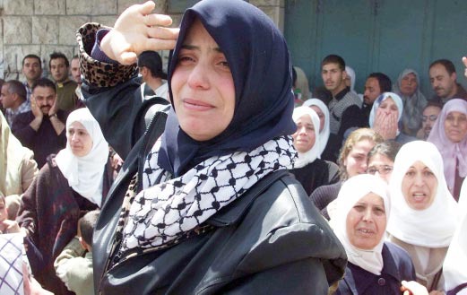 زوجة الشهيد مروان زلوم خلال جنازته، 23 نيسان 2002.