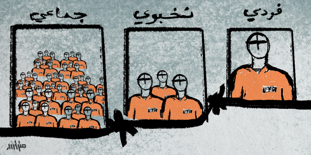 ينقسم الإضرابُ من حيث عدد المشاركين فيه إلى: فردي، ونخبوي، وجماعي. ورغم كون الإضراب الفردي نخبوياً في حقيقة الأمر، إلا أننا نفصلهما عُرفاً لما جرى عليه الاصطلاح الاعتقالي من جعل الإضراب النخبوي ما شاركت فيه نخبةٌ تتجاوز مفهومَ الفردي وتقلُّ عن مفهوم الجماعي، كما كان الحال في إضراب الأسرى الإداريين عام 2014، إذ شارك فيه من بدئه إلى آخره ما يقارب الـ80 أسيراً، واستمر نحو 63 يوماً.