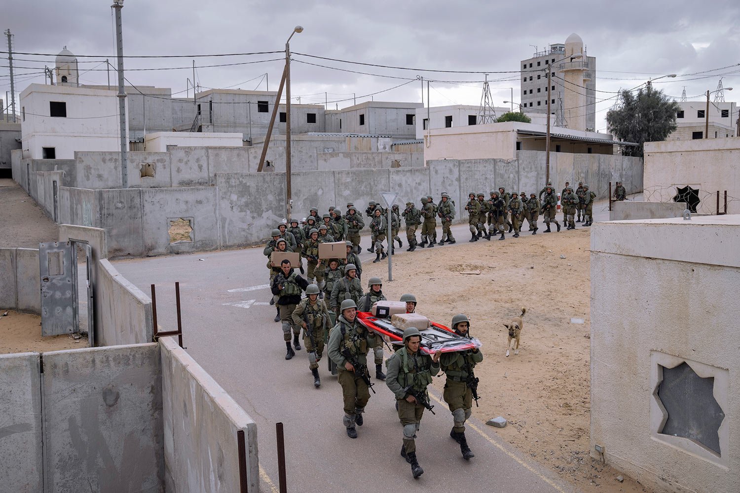 جنود من جيش الاحتلال خلال تدربّهم على تكتيكات الحرب الحضريّة في المدينة المصطنعة في قاعدة تسليم العسكرية في النقب (2022) (وكالة الصحافة الفرنسية).